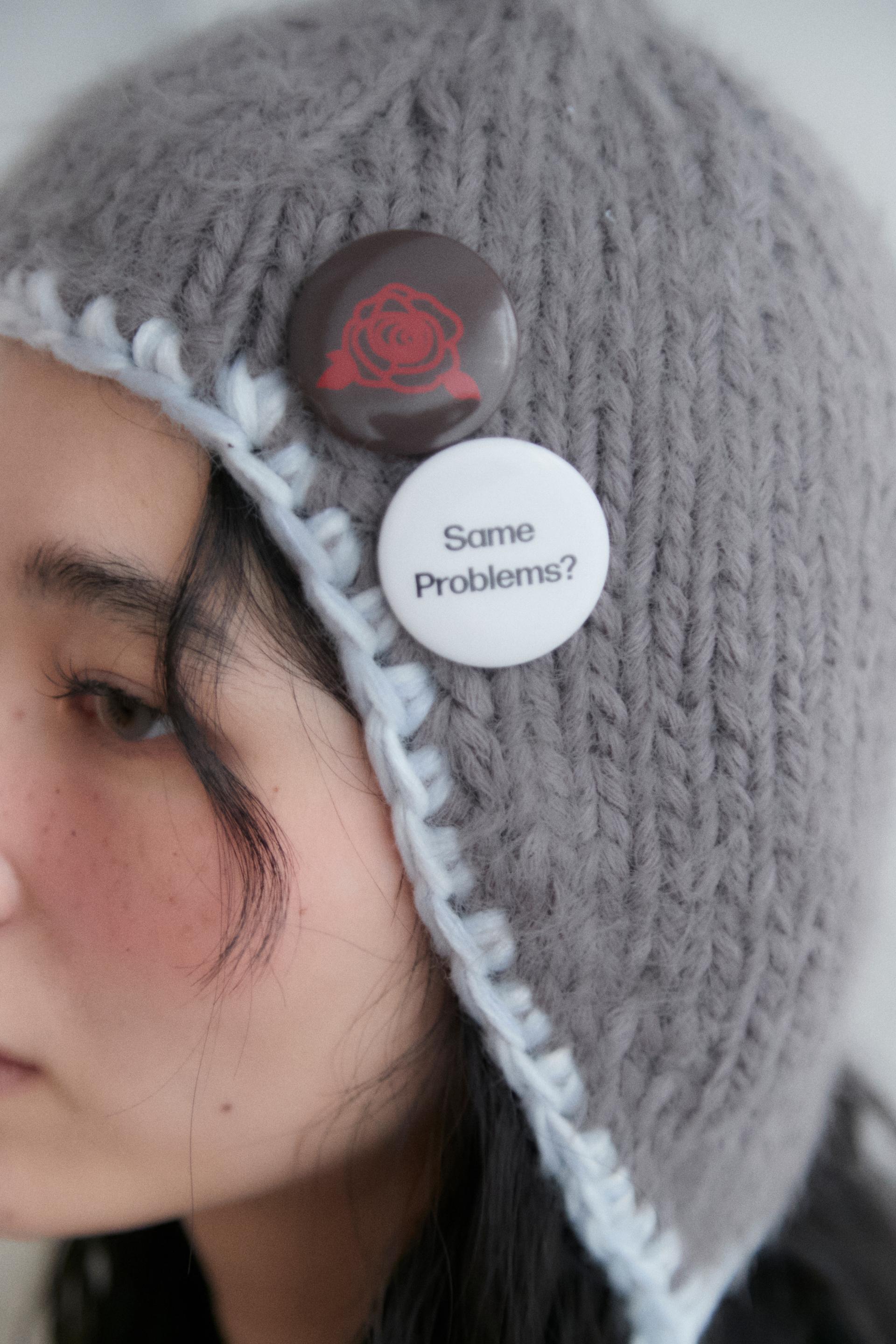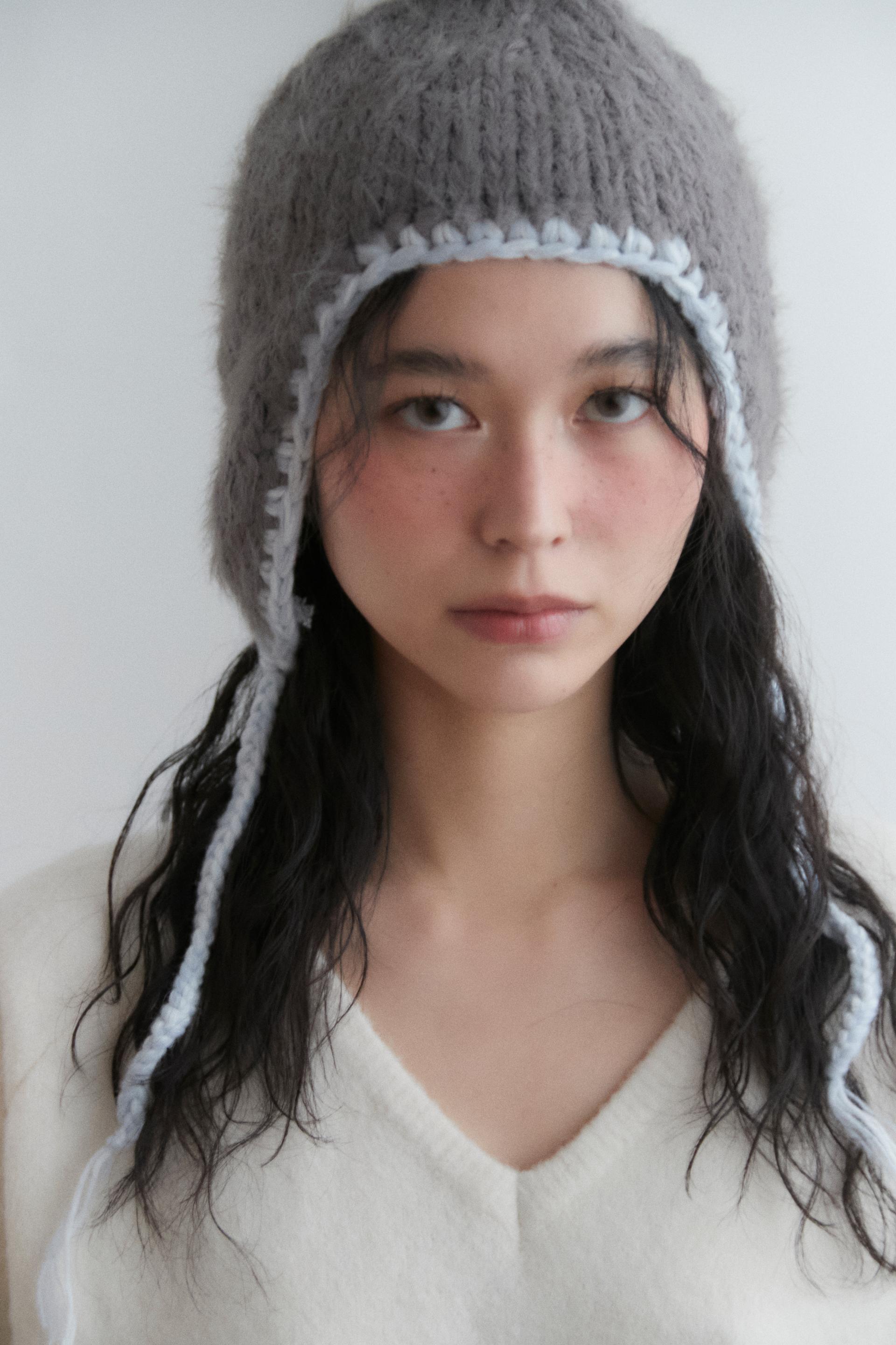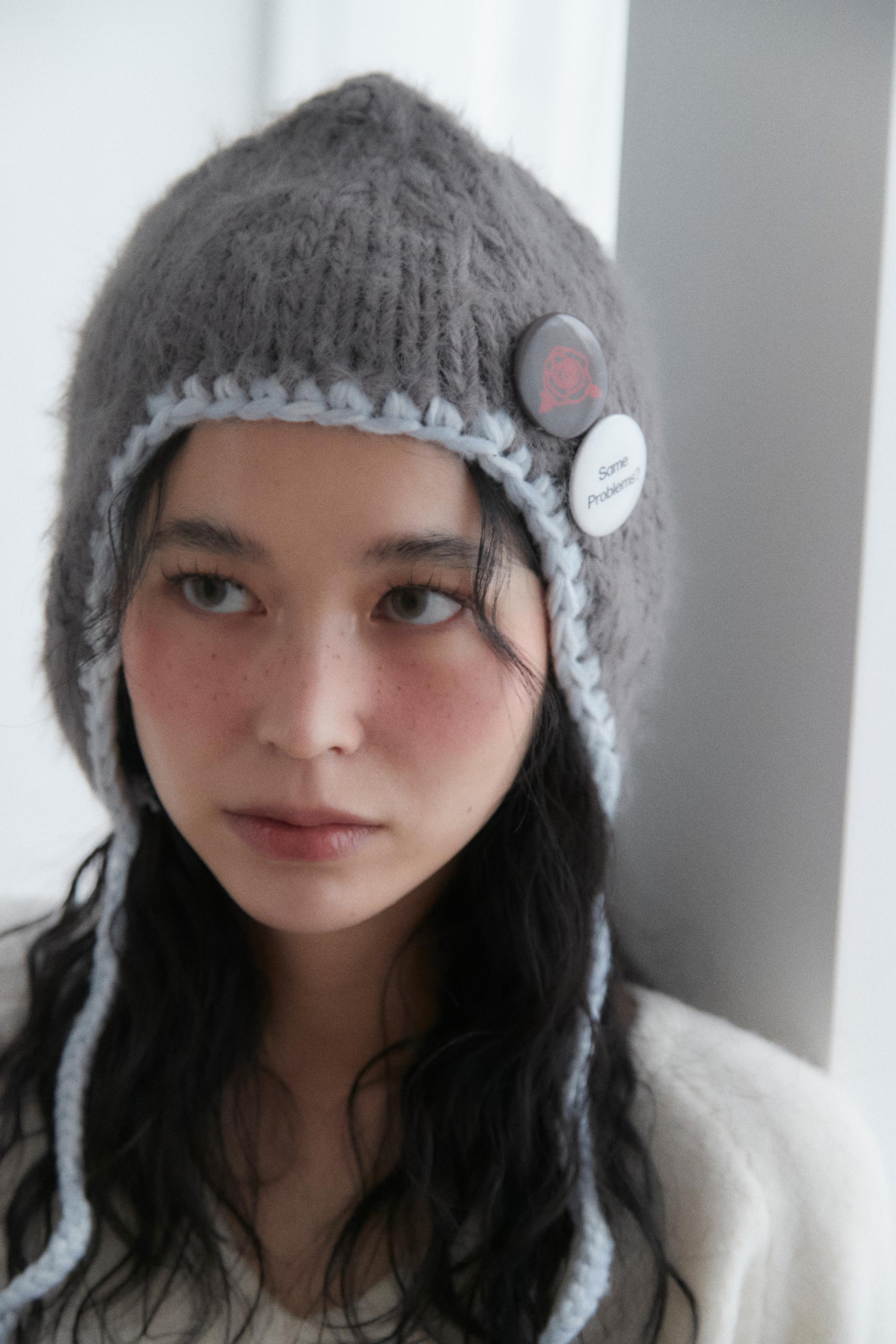 - Handmade knit hat with a loose outfit