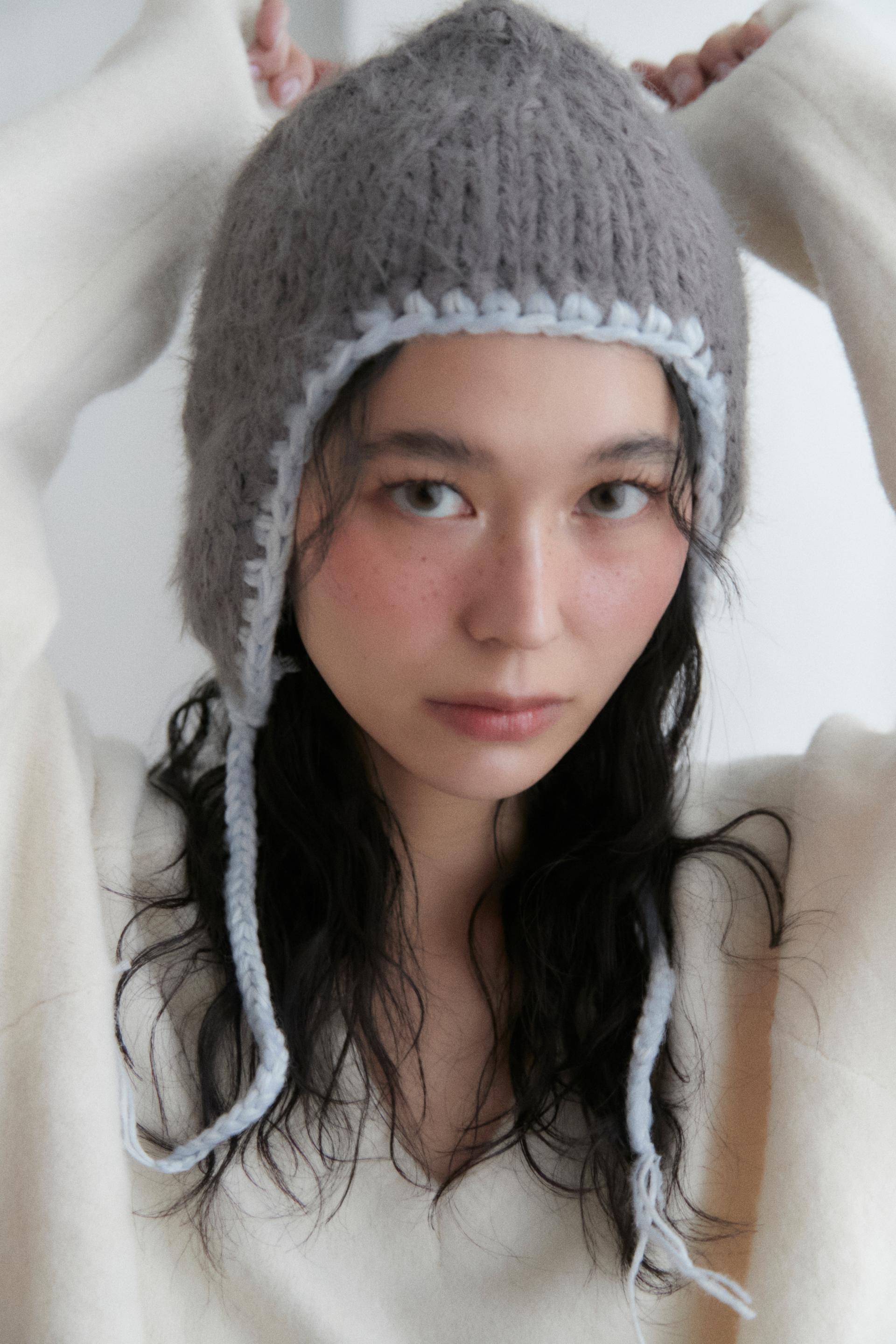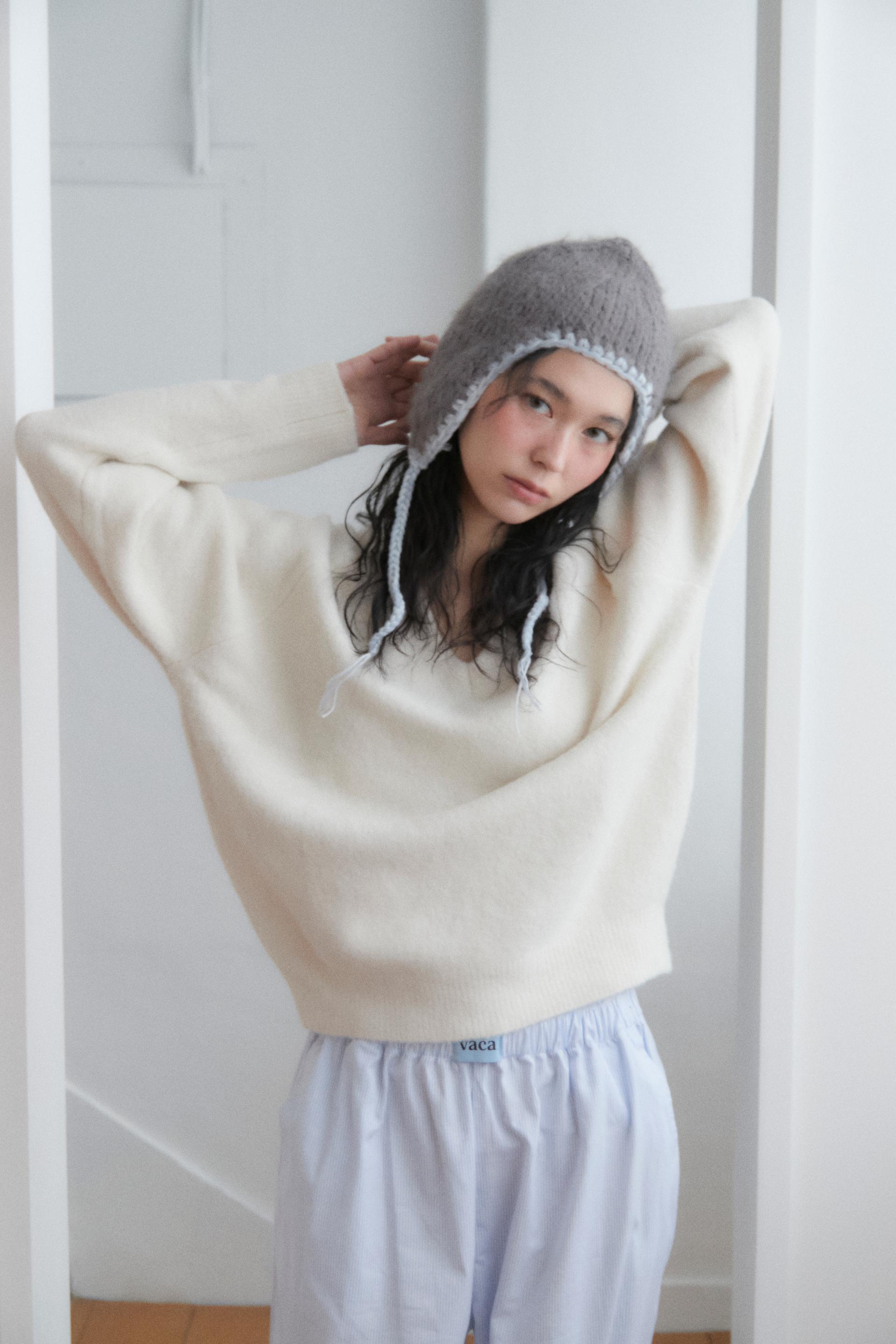 - 루즈한 아웃핏의 손뜨개 핸드메이드 된 vaca. 바카 니트 모자