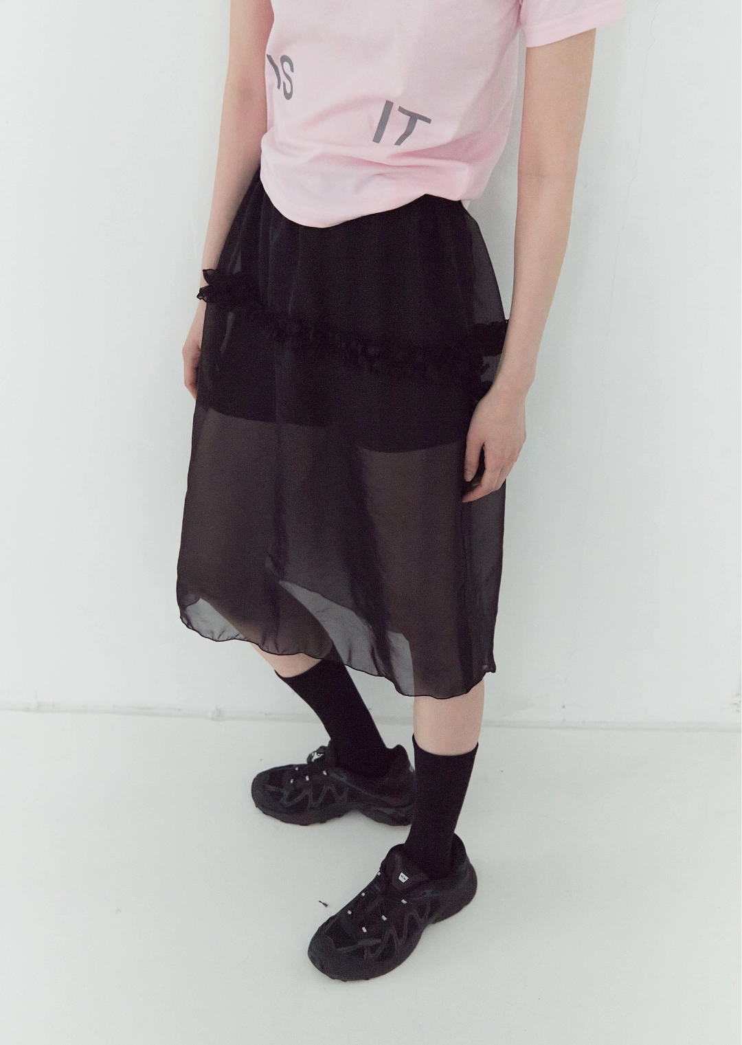 BLACK SEE-THROUGH FRILL MIDI SKIRT