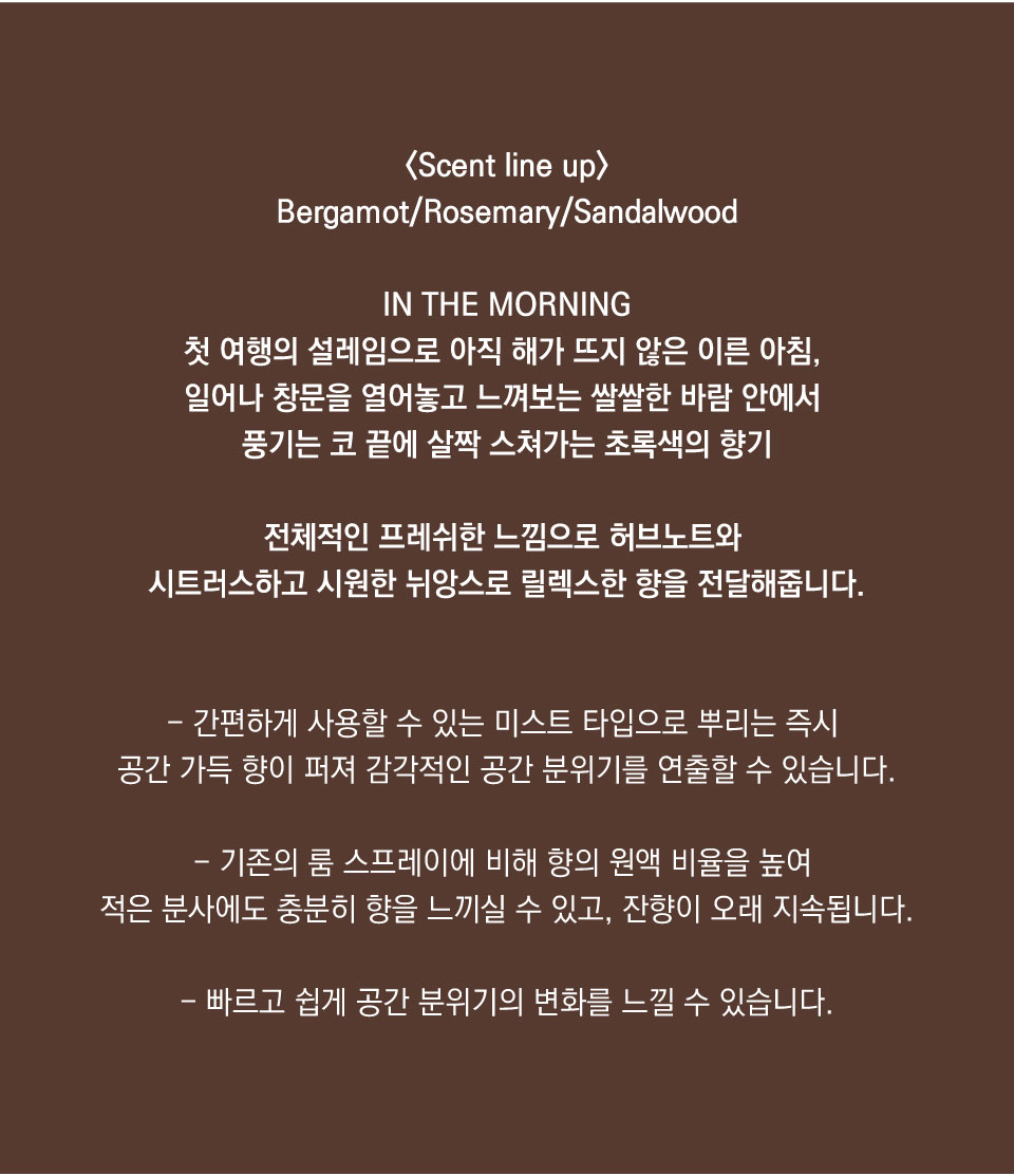 - 기존의 룸 스프레이에 비해 향의 원액 비율을 높여 적은 분사에도 충분히 향을 느끼실 수 있고, 잔향이 오래 지속됩니다.