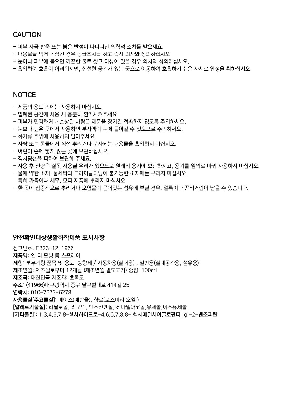 - 패브릭이나 커튼 등에 사용 시 30CM 이상 떨어진 곳에서 분사하시고 환기 후에 사용하시면 더욱 정제된 향을 느끼실 수 있습니다.
