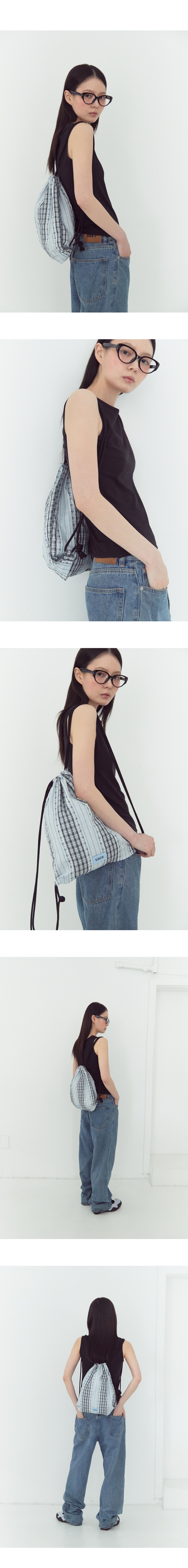 - 부드러운 면 소재로 제작되어 프린지 디테일의 체크와 스트라이프 패턴이 믹스된 vaca. 짐색 가방.