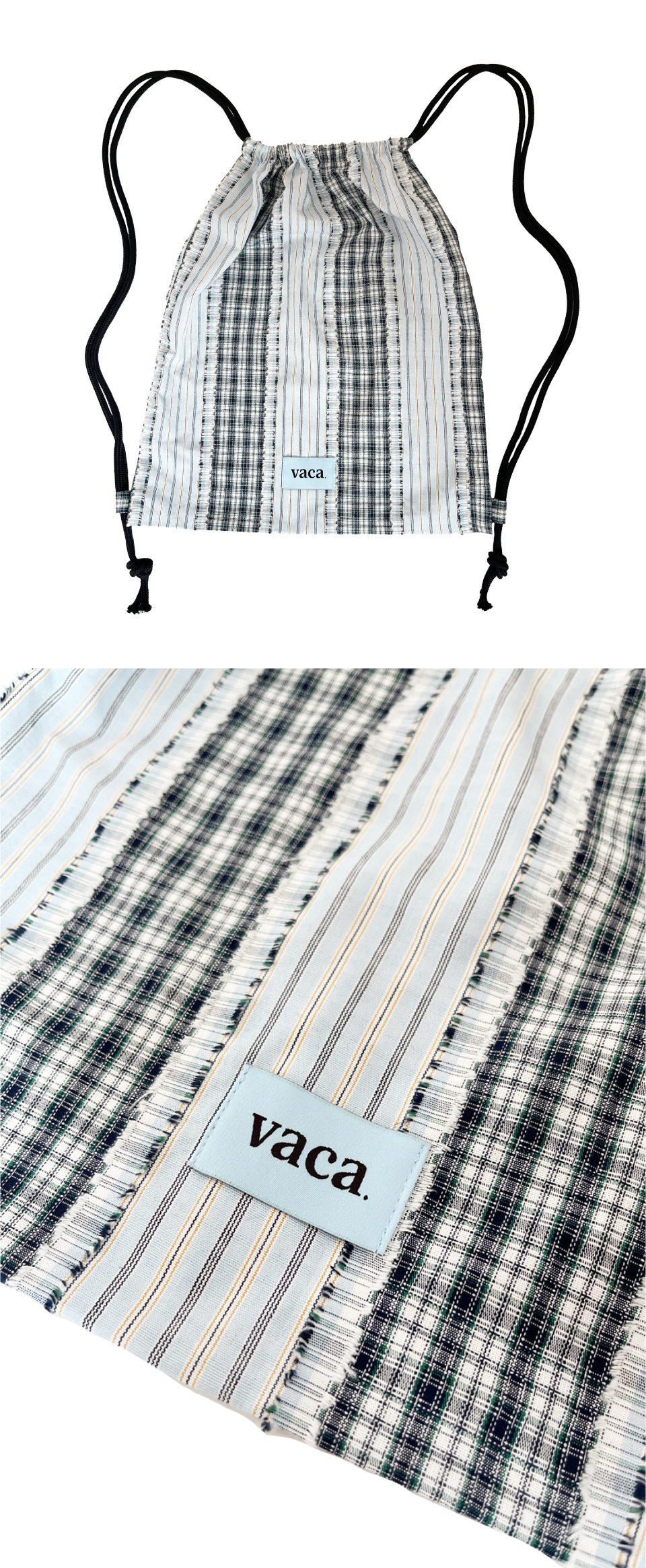 - 부드러운 면 소재로 제작되어 프린지 디테일의 체크와 스트라이프 패턴이 믹스된 vaca. 짐색 가방.